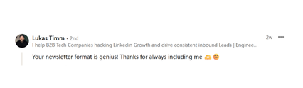 3.000+ people subscribed on LinkedIn (opening rate 25-30%), monthly organic growth ~200 subscribers